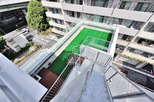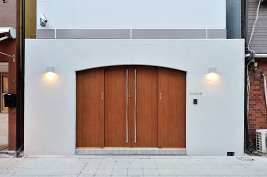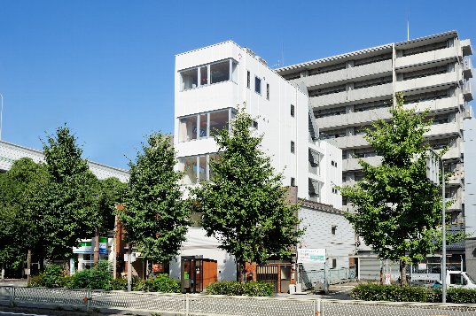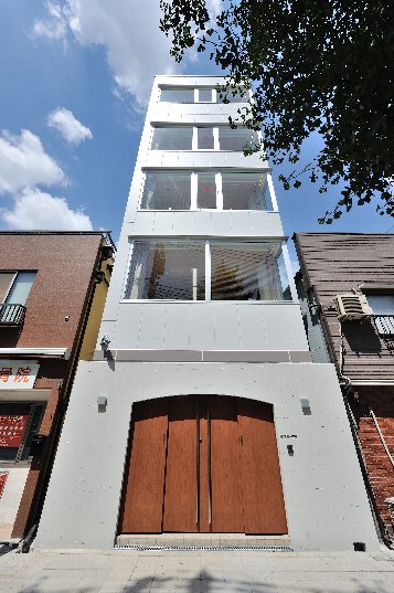 そのような諸条件を背景にして,1階門扉は完全に視線も含めてすべて閉じてしまい,その内側にガラスのエントランス扉をしつらえた。ガラスの扉には電気錠が仕込まれており,視覚的には解放されるがセキュリティ面でクローズとなる。そして夜は野太い鉄製門扉で完全に閉じられるのである。しかし2階から上階は全面ガラスのサッシで視覚的に外部に開かれている。南面は「港通り」という幹線に面しているが,太く根付いたイチョウ並木が四季折々の姿を子供たちに見せてくれるだろう。